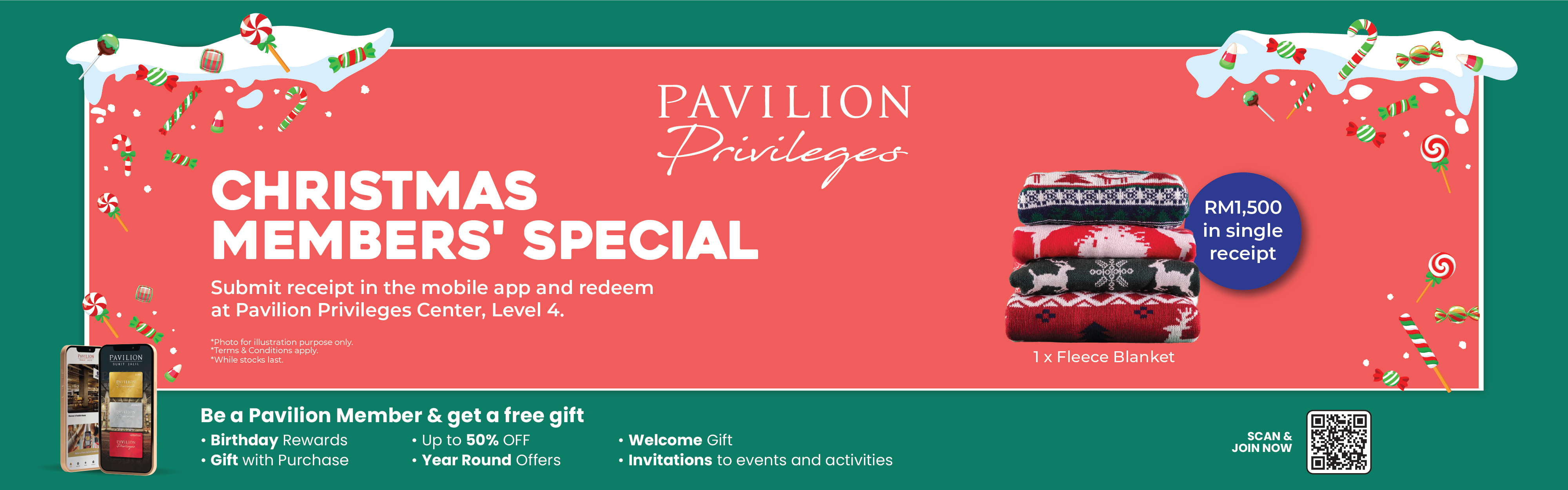 Spend RM1,500 in a single receipt, submit receipt via the Pavilion Bukit Jalil mobile app, and redeem 1x Fleece Blanket at the Pavilion Privileges Center, Level 4 (Pink Zone).