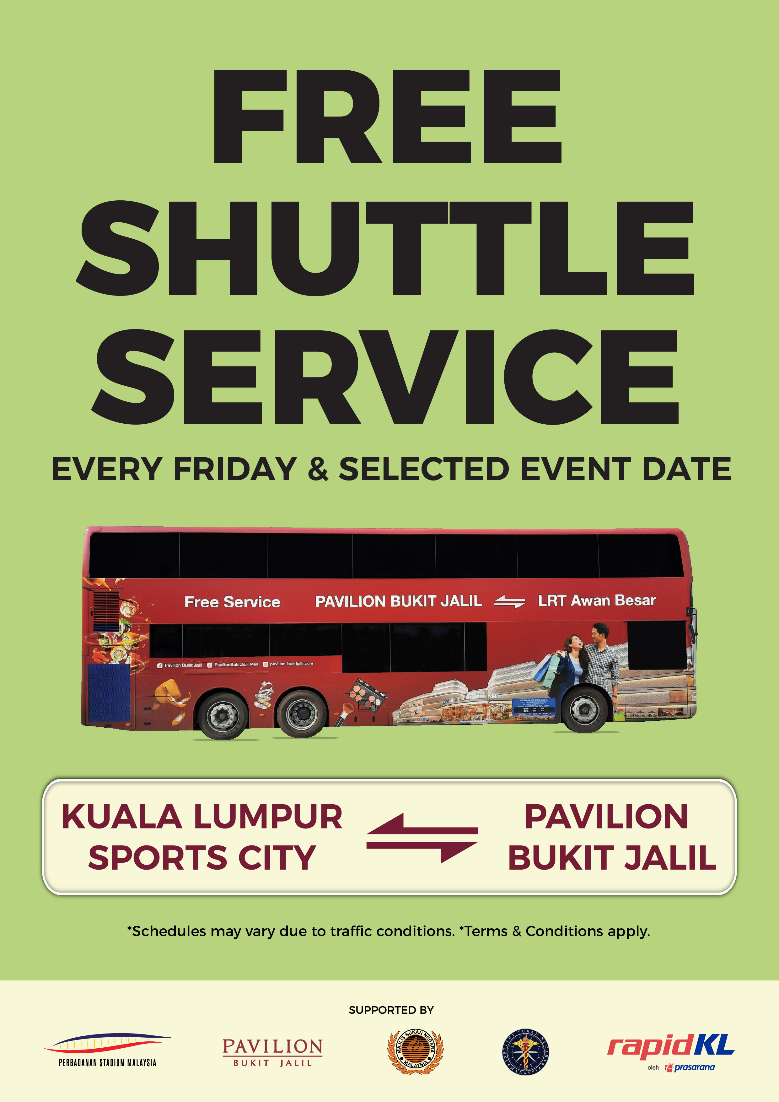 Great news! Now you can enjoy a relaxing Friday with a quick shopping spree and lunch at Pavilion Bukit Jalil, thanks to our NEW Free Shuttle Service route from Kuala Lumpur Sports City (KLSC) to Pavilion Bukit Jalil!